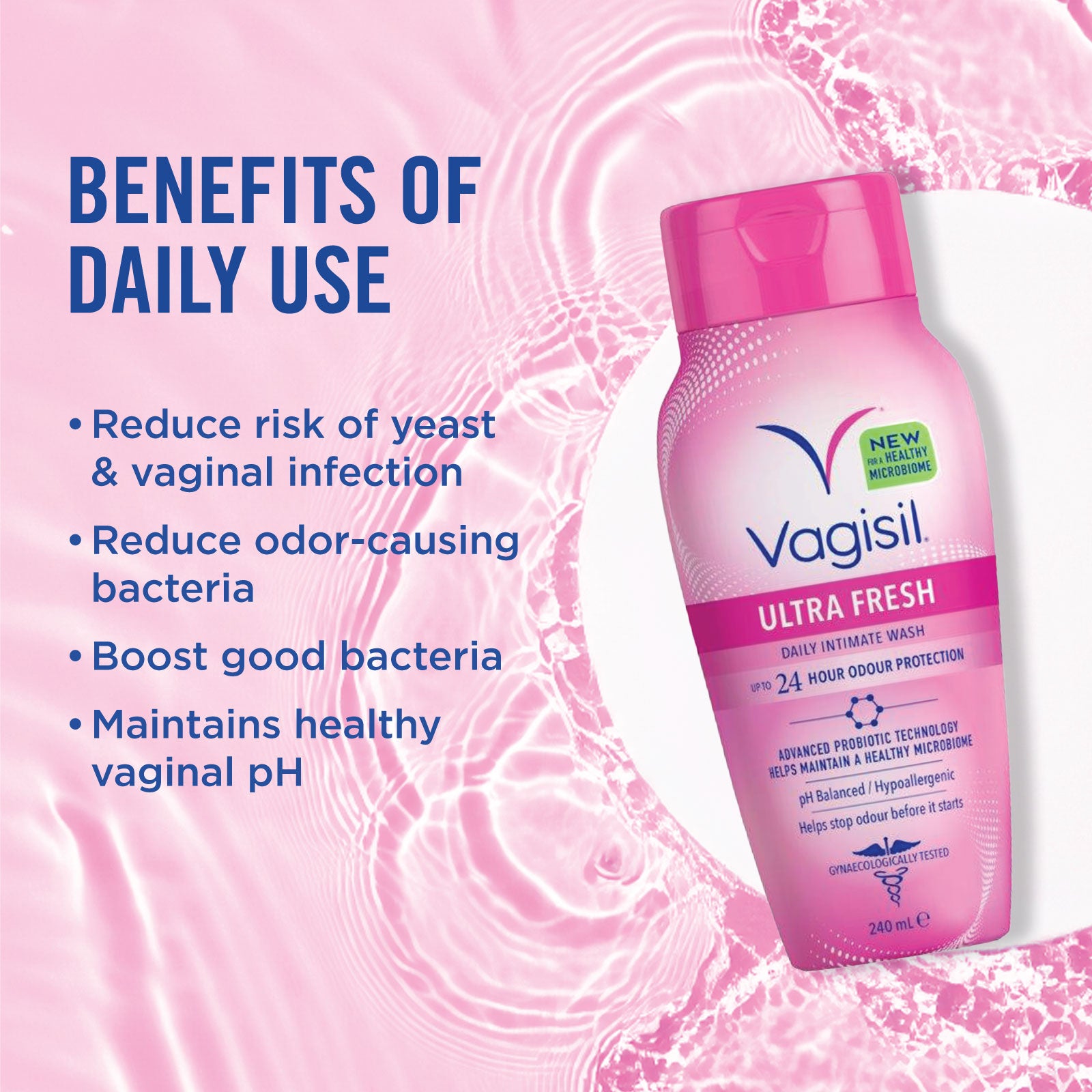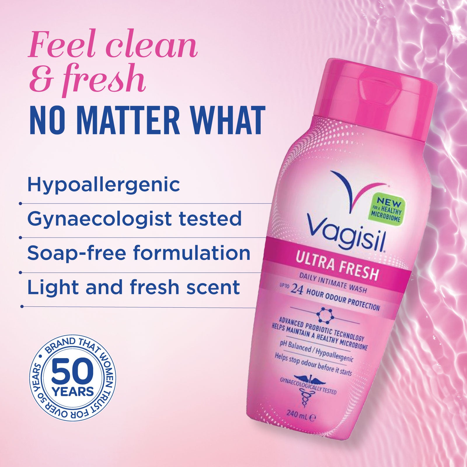 Unlike other brands of intimate washes and soaps, Vagisil® Ultra Fresh Intimate Wash is infused with a patented Odour Control Technology that doesn’t just mask odour with a fragrance, it actually helps prevent odour from happening in the first place. Your intimate skin is delicate and sensitive and not all washes are made with your intimate skin in mind. All Vagisil® washes are pH balanced, soap-free and specially designed for the unique needs of intimate skin. They are also gynaecologist tested, hypoallergenic and gentle enough for daily use. Now you can feel fresh and confident all day long.